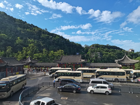 从洗手间出来后的平台上,可以看到景交车满满当当,都是昨天夜游泰山观日出的下山游客。