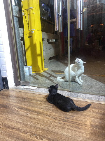 一黑一白两只猫,听店员说都是流浪猫,店员经常喂一些食物,这只猫也把这里当成家了!