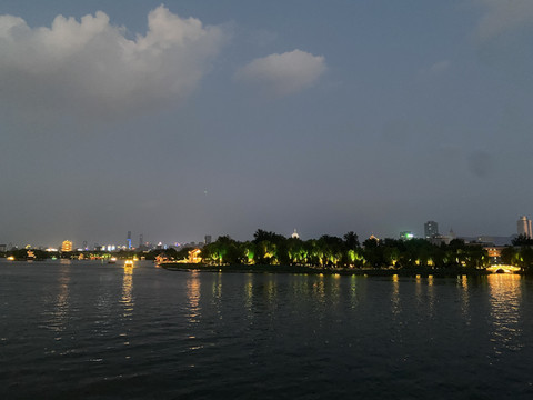 不知不觉,夜幕降临,夜幕下的大明湖,湖岸线的灯光还可以再增加一些!