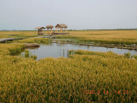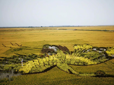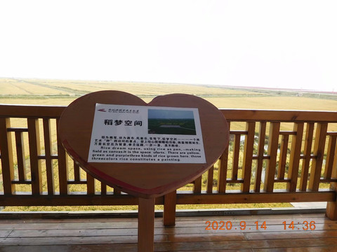 “稻梦空间”,“篡改”了美国电影《盗梦空间》的片名,实际上一望无际的稻田。尚未收割,金黄色的稻田与红海滩形成鲜明对比。
