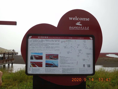 资料上这样说:“红海滩国家风景廊道”坐落于辽宁省盘锦市大洼县内,以红海滩为特色,以湿地资源为依托,以芦苇荡为背景,红海滩是大自然孕育的一道奇观,它确切出现时间无法考证,有学者称有了地球有了海的时候,就已经有了红海滩。