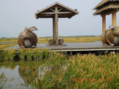红海滩的主要景点有廊桥爱梦、稻梦空间、卧龙湖码头、依水云舟、爱情宣言廊,时间所限,我们只看了百鸟翔滩,廊桥爱梦、稻梦空间三个景点。