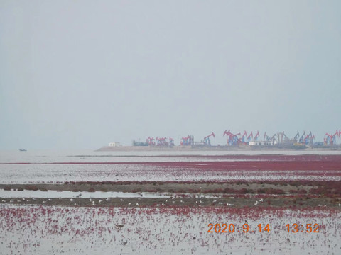 红海滩远处就是钻井和采油机。