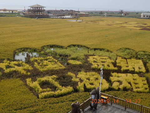 今天终于亲眼见到了稻田作画的美景,站在高处,可见稻田画出的仙鹤图样,飞翔的黑嘴鸥、双双对对的丹顶鹤、横行的螃蟹,构成了不同主题的稻田艺术画。还有“中国盘锦红海滩”字样,心形,铜钱形等形状,这真是别具一格的丰收的美丽和喜悦。