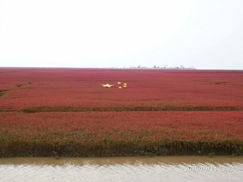 红海滩镶嵌着五个五角星,那就是国旗啊!