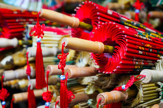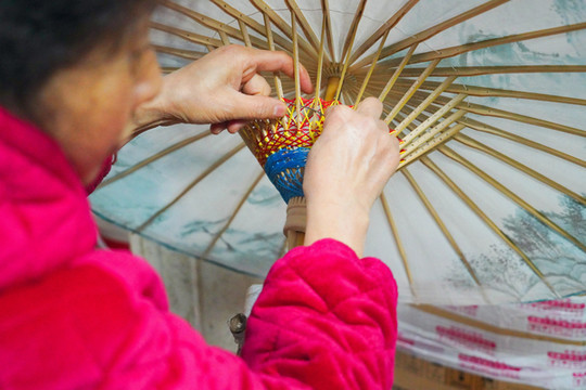 据说,一把传统的油纸伞以纸为面,竹为骨,发为线,经制作伞架、网制伞边、石印伞面、糊伞、烤伞、上油、穿线等100多道工序,全部由手工完成。而成品伞有一个标准,要求条子反复撑收3000次不损坏,清水浸泡24小时不脱骨,顶五级风行走不变形。令人惊叹不已的是一种叫“满穿”的工艺。伞架穿满各色彩线,虚虚实实、五彩斑斓,如同阳光下含苞待放的花。