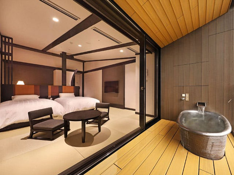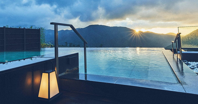 酒店总共有两个室外露天浴场,每天都会交换男女汤。这样就能让大家都享受到两个不同的温泉了。六楼的露天温泉正对着前方的山谷,可以欣赏到晨曦和夕阳。五楼的瀑布温泉则对着后面的山,瀑布蜿蜒而下直接流淌至你所处的温泉,身边是日式的庭院,不时还会有业飘落至身旁,也有一种特别浪漫的气息。另外,在室内也有2个浴场,以及一个桑拿间。但这里最最主要的不是露天温泉的无敌美景,而是在这里的每一个房间都会带有露天温泉,所以如果注重隐私的话完全可以在房间内尽情享受。