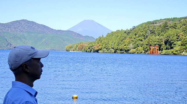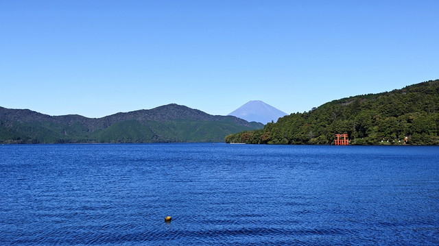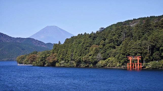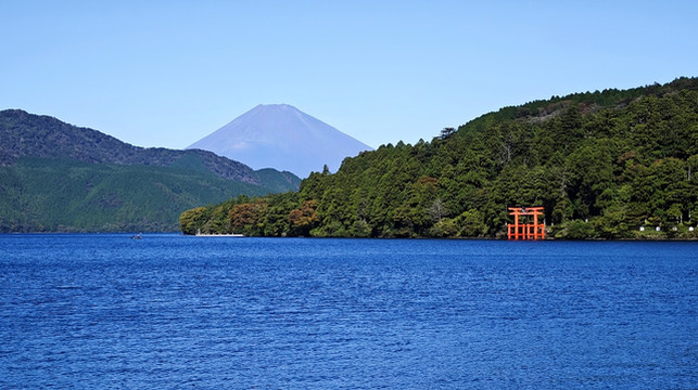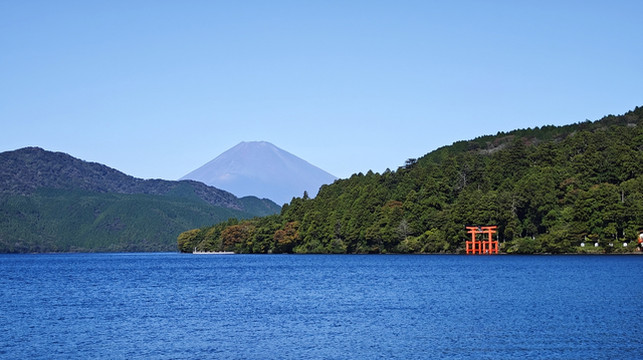 富士山、芦之湖、水上大鸟居同框。
