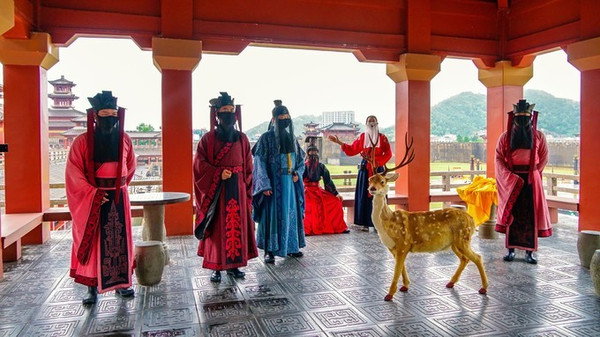 11;00左右还会上演一出“赵高指鹿为马”的戏码。讲述着当时赵高想作乱,恐怕群臣不听他的,于是他先做了一个实验:赵高驾着一头鹿随从二世出行,二世问他说:“丞相为什么驾着一头鹿呢?”