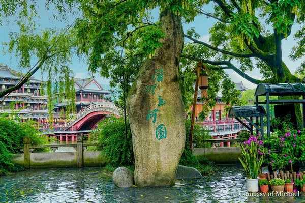 清明上河图景区占地面积600余亩,景区分外城、里城和宫城。园林景观费了一番心思,每个角度都能找到不同的美感。城中有“汴河”蜿蜒,形成了城外有城,河内有河的独特格局。真正是“一朝步入画中,仿佛梦回千年”。