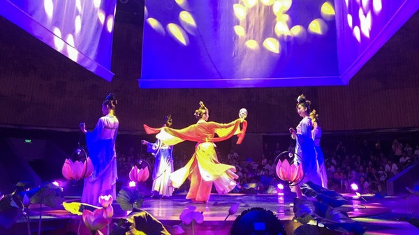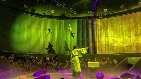 有幸看到《游龙戏凤》——这场全息环幕电影演艺秀,故事源自宋徽宗与李师师之间的爱情故事。该节目的表演区位360度全方位环绕式大厅,节目通过全息投影,透视幕,舞美特效,真人表演于一体,引领观众进入杏花楼,竹林,战场等多个立体场景画面中,让人感觉如临其境,陶醉其中。