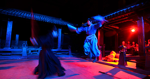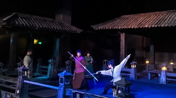 接下来欣赏的是《英雄比剑》,可谓是刀枪明火,特技满满。演员们吊威亚满场飞,视觉效果相当震撼,现场看真人去表演打斗场面,既刺激又惊险,现场音效特别震撼,仿佛领略了一部电影厮杀场面。