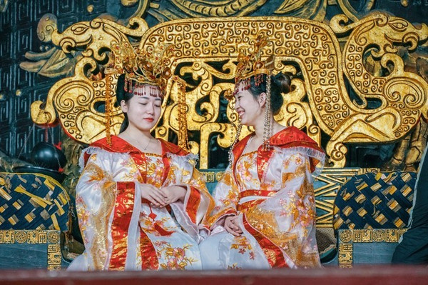 殿正中央一把金色的龙椅高高在上,显得非常庄重威严。许多人都聚集在龙椅下方,等待着穿龙袍,皇妃的衣服进行拍照留念,体验一回皇权至上的乐趣。拍照需自费,不同行头配置,价格也不一,几十到几百元不等。
