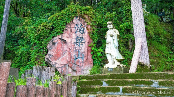 山脚下这座简易酒楼是朱富,朱贵两兄弟开设的“朱贵酒楼”,游客在这里可以体验有趣的“摔碗酒”。上面左右两排木桩围成山寨,每根木桩上都有一位梁山好汉的人物介绍。