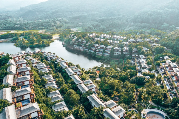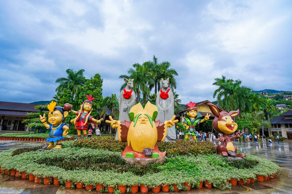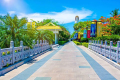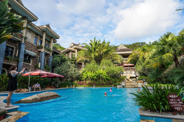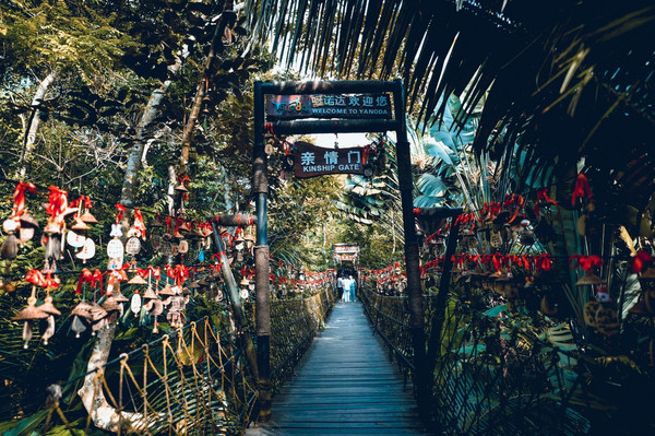 兰花溪是一个微缩的热带景观,一些叫不出名字的奇花异草,极具特色的茅草屋,长藤下的树桌树椅等。幽静的雨林中,经典的中国传统造园技巧与热带雨林文化巧妙的结合
