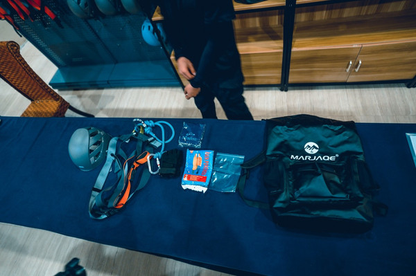 背包里面是头盔、安全绳、手套、魔术头巾、雨衣、手机防水袋