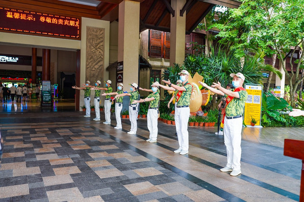 景区工作人员都面带微笑,右手摆出剪刀手势,萌萌地一声“呀诺达”。