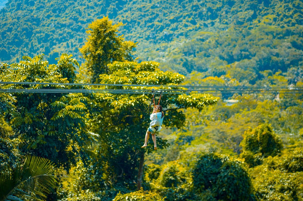 呀诺达雨林文化旅游区的高空飞滑索是亚洲最长的雨林高空滑索,单程608余米,滑行设计时速为3.2米/秒,从山顶站到桐亭站仅需190秒的时间,滑行在飞索上居高临下体验雨林翱翔之美。