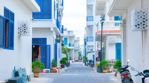 天涯镇位于 三亚 市西部,拥有风光旖旎的红塘、三美两大海湾,走进这里的街巷,有种走在 圣托里尼的错觉,因此,这个蓝白小镇也被游客称为: 三亚 版“ 圣托里尼 ”。