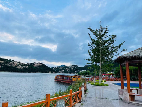 想到美食,还要搭配美景。有山有水,有美景、有美食才是完美的。于是,驱车到了环境优美的松月湖旅游度假区。 傍晚,夕阳映照山峦霞光倾泻万山,宛如少女般清透。令人陶醉在满山苍翠,一水碧波,鸟语花香,让人流连忘返。