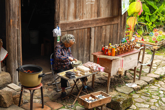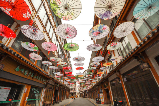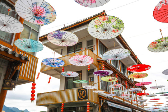 穿过一条明清建筑的古街,各式各样的油纸伞悬挂于上空,在灰白相见的建筑中显得尤为醒目,两边街道上都做起了生意,许多大城市有的小吃店铺也开到了这个镇子上,正因为有了交通的便利,古有廊桥,今有高速公路、高铁、飞机,才使得养在深闺的美景也被人发现。