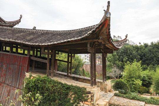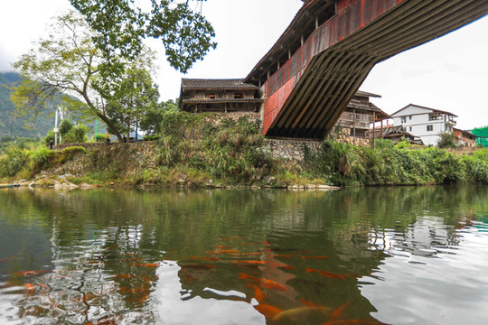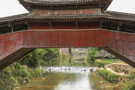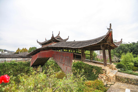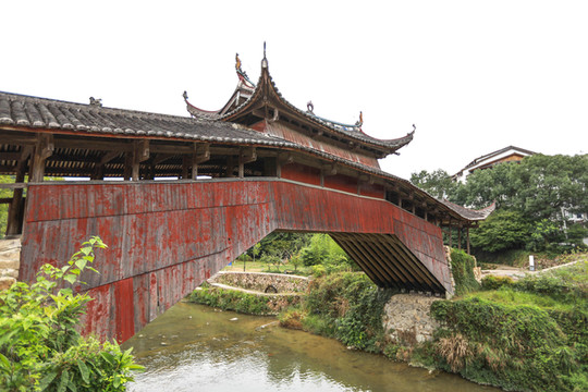 溪东桥,俗称上桥,位于东溪与南溪合并的河段上,始建于明隆庆四年(1570年),桥长42米,廊屋高10米,净跨31米。桥为重檐屋顶,两个楼层12个角翼高高翘起,在远处青山的映衬下,飞红一抹,溪东桥宛如是一位隔绝尘世的仙子。