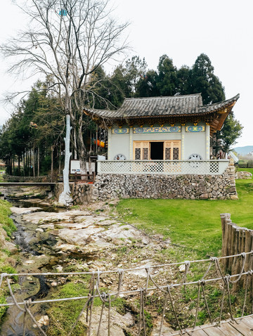 宫殿式重檐,结构精巧,造型古朴。北涧桥的美不仅美在桥本身的轻灵飘逸或是拥有虹桥的独特结构,更美在桥周围的环境。两条溪水在桥边汇合,溪水清澈见底,水面上还有一条用石梁搭起来的小石桥,接以矴步。