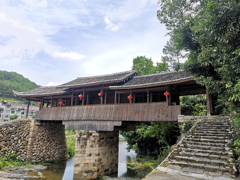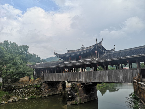 依水而行不远遥遥就看见北涧桥横跨溪水之上,两颗参天古树在桥头环抱,桥下溪水平静,好多游人在不同角度拍摄这中国最美的古代廊桥。桥头一条小商业街掩映在古树下,古树参天枝繁叶茂,仔细一看标牌原来一棵是香樟树另一颗是乌桕树,按照介绍已都有千年以上树龄,桥身红色,桥顶是灰黑色的瓦,在蓝天白云千年绿树的掩映下,最美廊桥的确名不虚传。慢慢从廊桥走过,想风雨之时在廊桥内坐观风云变幻、烟雨迷蒙,应该是别有情趣吧。