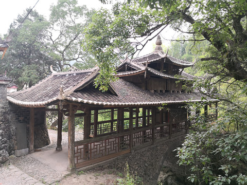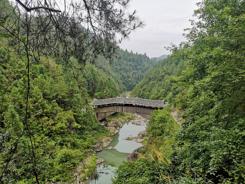 19日早起后吃过昨晚买的面包、咸笋丝、水果等,提前几分钟来到车站,师傅已经到了,正在吃刚买的包子,我俩忙说你慢慢吃,时间还早。出发后,路上很少车辆和行人,一来是时间早,二来也是去洲岭的车少。师傅很健谈,也很正能量,他说以前自己做陶瓷生意,现在年纪大了回到老家。还说年轻人应该奋斗,老年人也要照顾好自己,做力所能及的事,让自己有事做,活得充实点。没想到的是他已经68岁了,还这么好的身体,这么敏捷思维。车开出一段时间后,路果然比之前窄了许多,而且山路起伏转折较多。等到看到三条桥大大的路标后,车左转到一条更窄些、仅能二车通行的山路,这就应该是查路线时网友说的大路边下车,再往上走的那段山路。不久(车倒是没用太长时间,但步行的话的确的需要40几分钟,而且体力还得是不错的人,最主要的是你不知道看完三条桥再回到大路边第二班车几点会来)车开到路的尽头。一户灰色三层小楼矗立在这山上平坦一点的地方,按此前查到的资料介绍,沿着边上唯一的一条小路下去15分钟左右应该就会到达。师傅为了保证准确,到小楼前又问了一下住户确认是这条路后,说三条桥我也没看过,正好和你们一起去看看吧。一行三人沿山间小路蜿蜒而下,途径一亭上书溯源亭,亭内对联写道:深山峡谷前人睿智跨天堑,心旷神怡后世虔诚品古桥。明显是现代人所写,但对仗工整,非常适合此情、此地、此桥、此景。再前下行不远,深山峡谷中一座古廊桥出现,知道那一定是三条桥了,虽然此地人烟稀少,但古桥保护的很好,桥上桥下前后欣赏,的确是周边风景优美、水清见底。但没看到如歌提到此桥上的那阙点绛唇词,也或是岁月风雨将其剥蚀了吧。从来路过桥后在桥头观景,无意中发现右前方对岸石壁上有三个方形孔洞,想来可能是古三条桥的位置,现在看到的三条桥也是得名于此。