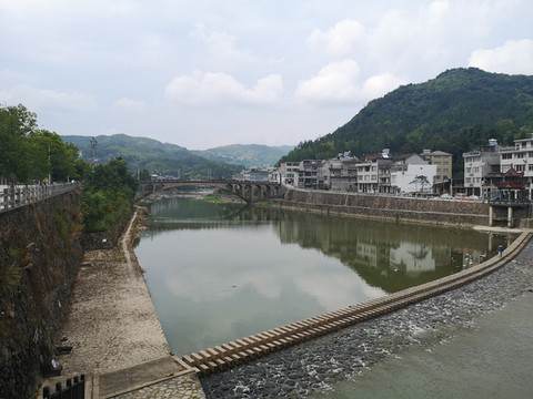 我和妻沿碇步向河对岸慢慢前行,河水清澈、浅滩处游鱼很多,长度大多在15至20厘米左右,见到游人就快速游走,在石缝间不时翻出浪花。沿碇步走向对岸,有几名当地的孩子在河边、碇步上戏水,脸上是在城里孩子脸上很难看到的笑容,快乐而纯真。拍照留念后沿碇步返回再走到大路边,街上非常干净,见到一辆环卫车,拿着水枪在冲洗马路,而不是用扫帚扫马路,颇为感慨!在仕阳车站上车后,回程不远就是胡氏大院,也或是旅游淡季、也或这里比较小众,除我和妻外再无其他游人,网友十年前的文章曾说这里的鸡汤很美味,进到两进院落内一看,完全没有供游人用餐的地方,有两处屋内应该是有人居住,由于房屋是原木本色、不施油彩,显得很古旧。道光年间建成的老宅能够保存至今也是非常不易了。出老宅到路上沿路前行不远就是雪溪桥,据介绍是浙江最大跨度石拱桥。一路欣赏木质廊桥,如今看一下这石拱桥,也是不一样的感受。