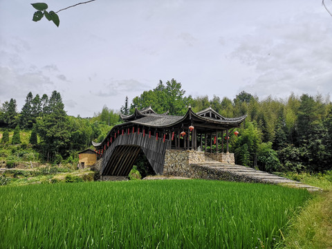 在回程的车上,告诉司机我俩要在刘宅桥附近下车,下车后没走多远就看到一座廊桥,新建还没彻底完工,看介绍是三魁廊桥,标牌上大世界基尼斯之最,中国单孔跨度最长的木拱廊桥,单孔跨度48米。上下两层,上层有中午宾馆老板娘介绍的秋千。确实很美、看起来也很壮观,但她不是我俩要看的刘宅桥,于是走回到路边问当地人刘宅桥的位置,在路人的指导下加上手机导航,沿路走了好长一段路,在手机提示下在大路沿左侧小路前行转弯,终于看到刘宅村这座始建于明永乐三年,清乾隆四十一年重修的刘宅桥,古称仙洞虹桥。桥并不高大,也是平桥,但上下两层,看起来非常安静秀美!桥位于村边,同样没有游人光顾,只有三两当地人在附近闲坐。周边山清水秀、稻田碧绿,刘宅村静静矗立。