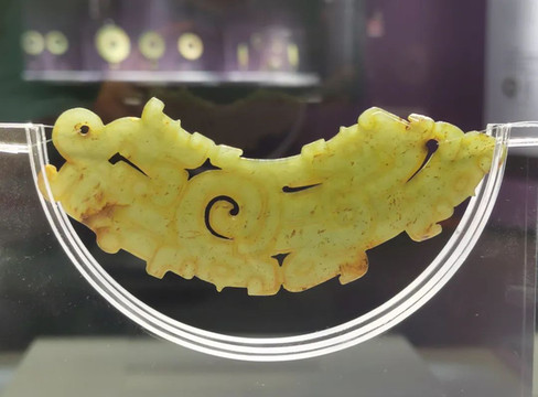 下图为西周的人龙纹玉璜,饰有两组对称的人龙纹,在人龙纹间饰透雕技艺,工艺高超,是虢国玉器中的精品。