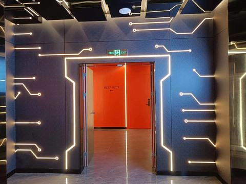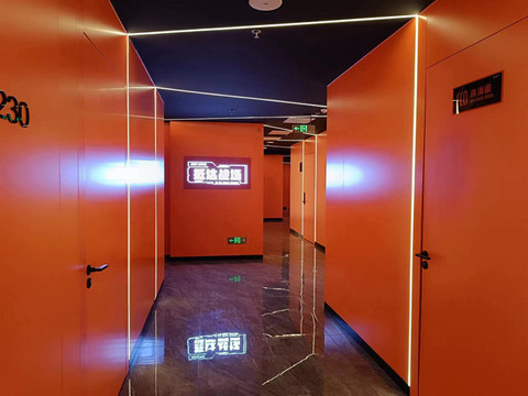 走廊以黄黑配色为主,设计感特别强,电梯前室是那种电路板的设计,完全符合我这种理工男的美学理念,这才是电竞酒店的感觉,而不是普普通通的酒店+电脑。