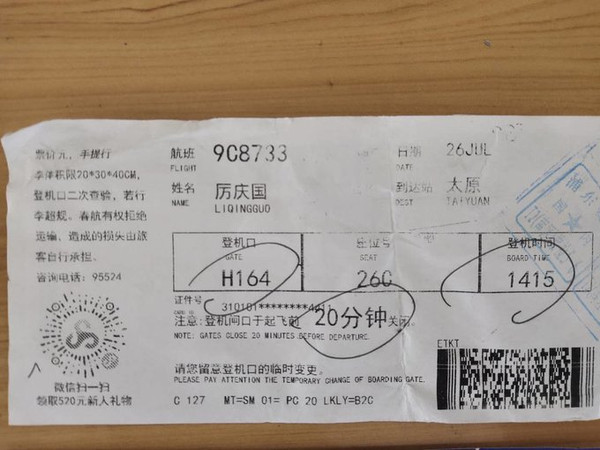 大交通:上海飞太原100元(机建燃油税)因为我购买了春秋“想飞就飞”套餐,只需支付两次机建燃油税