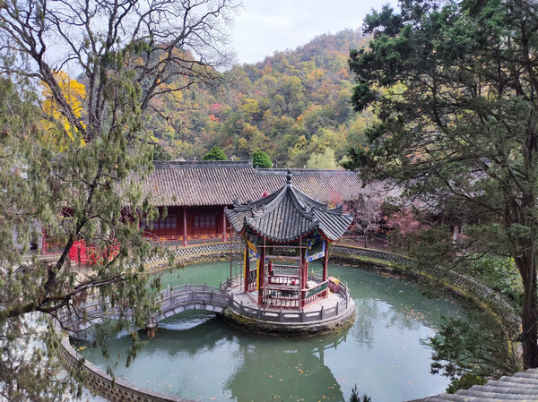 下山时走了另外一条路,直接到了一个院子里面,园中有池,池中有一辟谷亭,二楼看养眼。