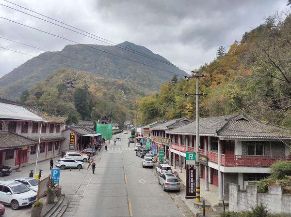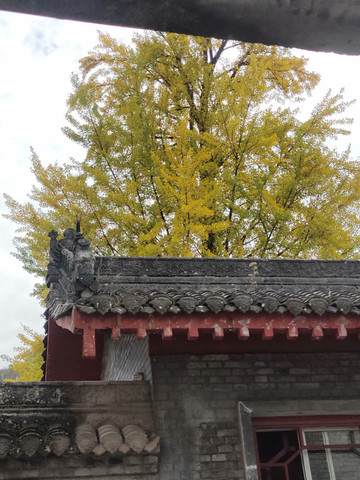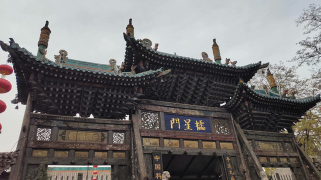 我们逛够逛完出来在附近转了一下,看见别人上了马路中央的牌坊,我们也上去远眺了一下,绿色那个棚就是张良庙门牌,在维修,远处的亭子是授书亭,发现了我心心念念的那颗银杏树在张良庙隔壁的张良山庄