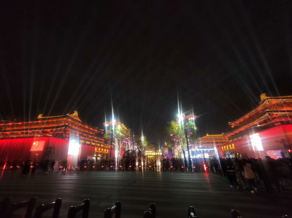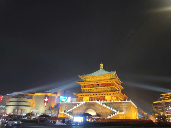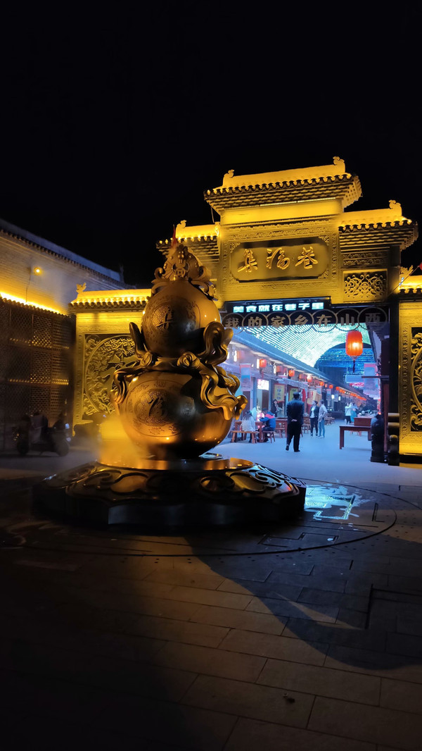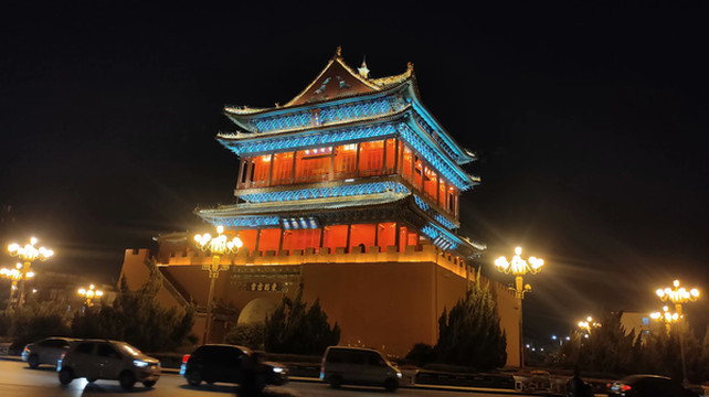 鼓楼夜景,从平遥高铁站开始就看到有人用鞭子抽东西的声音,在临汾鼓楼这里还更大声了