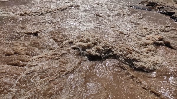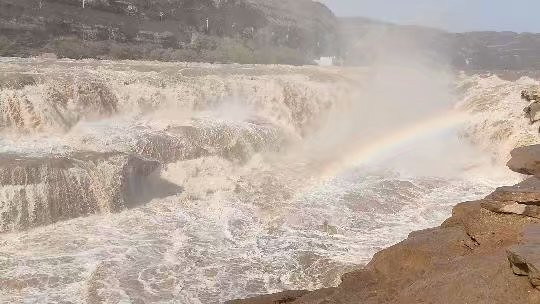 偏上游那边没有飞出什么水花,偏下游这边水花大到像下雨一样,可能是因为早上,偏下游能拍到彩虹,然而为了拍个彩虹,衣服都湿了,还好衣服是防水的,朋友说我穿了雨衣吗,摸一下那水,含着微量幼沙。