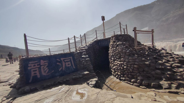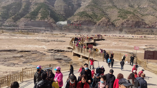 在桥上能看到古人看壶口瀑布的河中小岛,据说壶口瀑布一直往上游退,现在的瀑布已经离古人看的瀑布有3公里之远了,过桥走了一小段路,还要买个20元的景区接驳车费用,终于到景区了检票处了,今年都是在景区门口现场扫二维码免费预约游览的,进去以后是根本感受不到瀑布在哪里,导游说那边很多人的地方就是瀑布了。