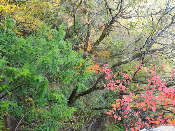 没看出龙的所以然,爬山就对了,学着前人拍的网红照。中华龙山对着是海底石城,当时没有开。第四个景点是红尘峡,好像连着天书崖的吧,这里终于能看到零星的红叶