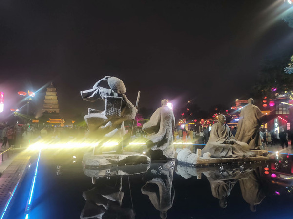 大雁塔是为玄奘从印度带回来的佛像、舍利和经书而建造的,所以广场上也有各种玄奘的雕像。