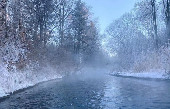 清晨的阳光照射,出现了雾凇,水流不急缓慢的漂着,手冻到拿出来拍照都难,但是视觉的感受是照片体现不出来的,仿佛就在仙境中慢慢的漂着,不愿苏醒,一直沉浸在仙境里。但是温度会让你醒过来,太冷了!