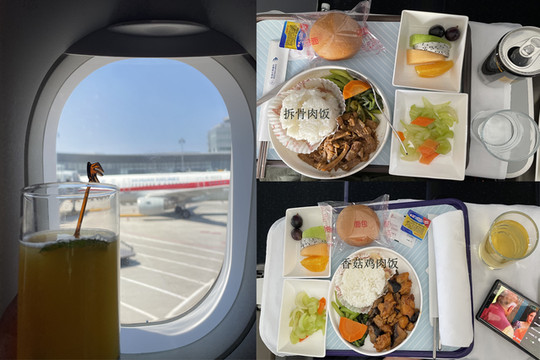 同样是无需排队登机。一套与来的流程一样。飞行大约40分钟后提供正餐。正餐的主食有3种选择:猪肉,鸡肉和鱼肉。我选择了叉骨肉饭。隔壁邻座选了香菇鸡肉饭。