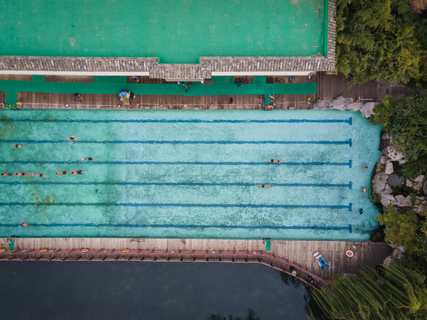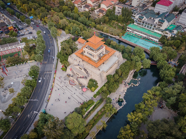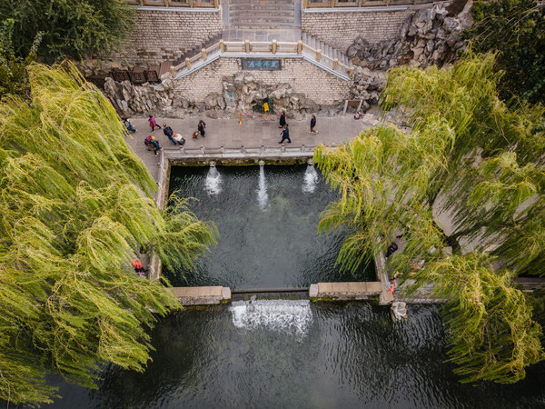 山坡上的泉水浴场是济南独一无二的特色,黑虎泉边以天然泉水为水源,清澈碧绿,免费入场,航拍特别好看。