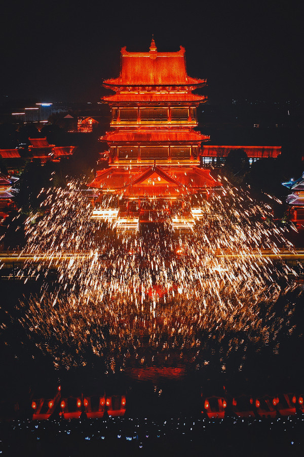 不容错过的演出是“火龙钢花”非遗打铁花表演,非遗打铁花是属于中国式的浪漫花火,具有“银河落九天”的视觉效果。打花艺人用花棒将上千度的铁汁击打到棚架上,黑夜瞬问被四射的花火照亮,流星如瀑,绚烂异常。