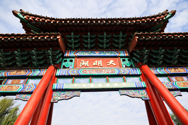 大明湖,宋代称“四望湖”,是济南三大历史名胜之一。在马可波罗游记中就曾写道“园林美丽,堪悦心目,湖光山色,应接不暇”。偌大的湖面由济南众多泉水汇流而成,最后经泺水河注入小清河。湖水水色澄碧,造就了济南优美秀丽的水乡风光,这在北方的城市中可谓凤毛麟角。