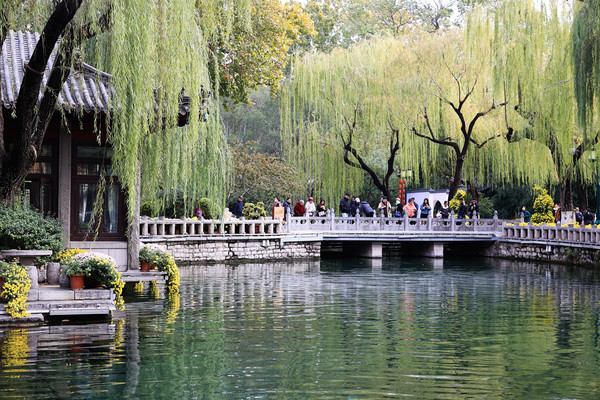 从大明湖南门出来向南走10-15分钟就到了五龙潭公园,玲珑小巧幽雅清净。平静的潭水倒映着古香古色的建筑,成群各色的鱼游弋其中,别有一番趣致。