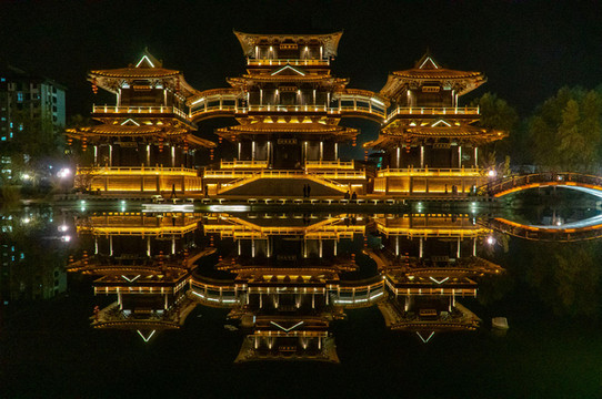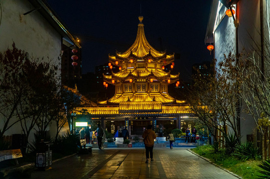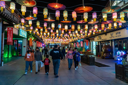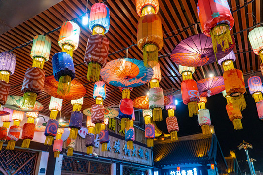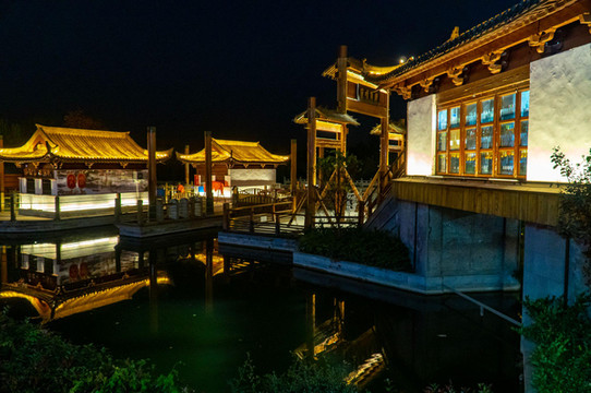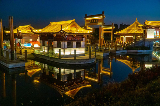 两岸杨柳依依,河中帆船店店。那时盛况空前,令人回味。经过一番装扮,当地重建运河古镇。日暮降临,灯火点点。万千灯光汇聚成片,粉墙黛瓦,木楼雕栏。一切如诗如画。走进古镇,仿佛回到隋唐。