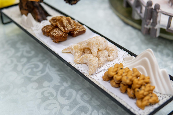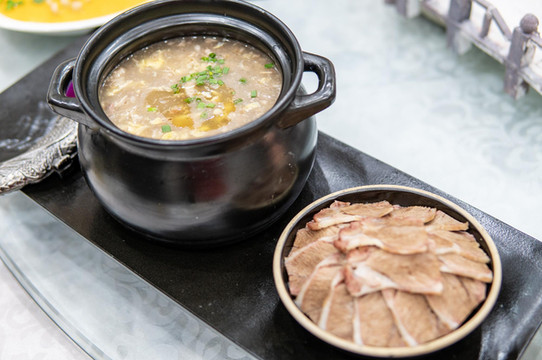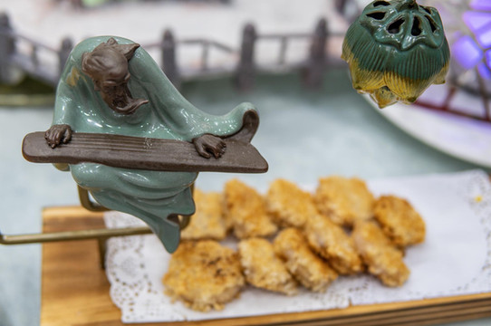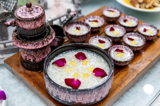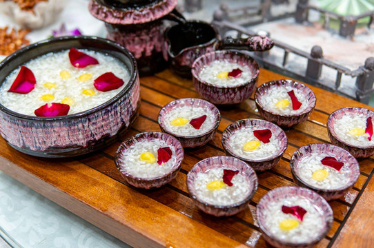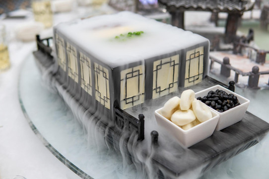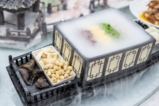 最后一道菜是玫瑰银杏。这是特别的糕点。古人讲究时令而食。银杏飘飘,金黄一片。深秋时节,摘下银杏果子,用玫瑰点缀,做成芬芳糕点。初入口时,清甜弥漫,玫瑰花香四溢,口齿留香。到了后面,则是银杏味道,多种交杂,分外享受。
