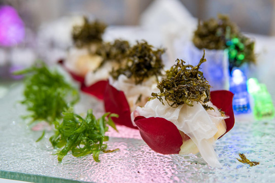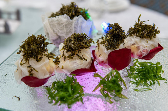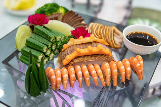 第一道是虹桥拼盘,有虾,秋葵等,再用胡萝卜等雕刻成精致的拱桥。